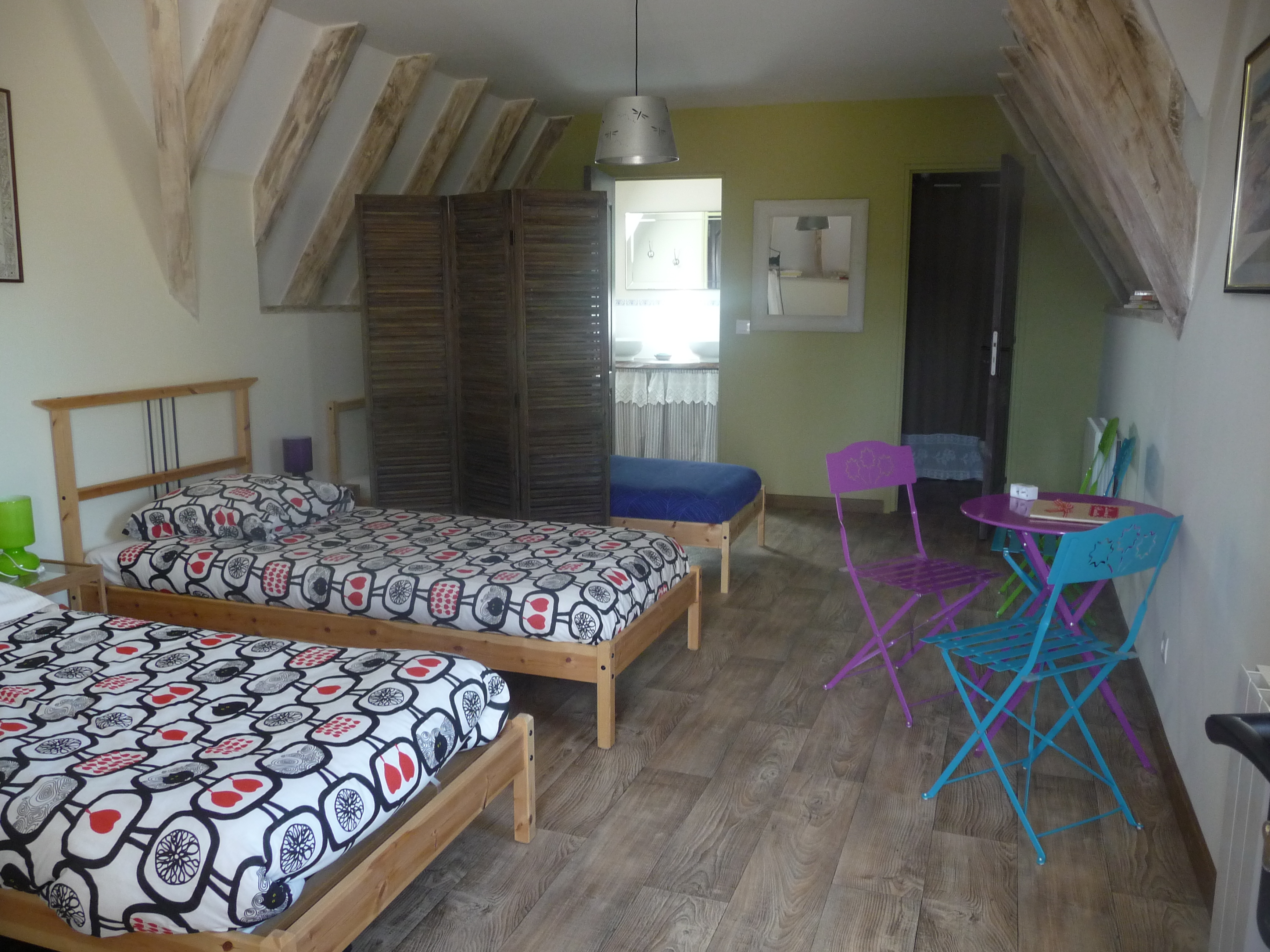 Très belle chambre de 35 m² (5 lits en 90*200) avec poutres apparentes : une salle d'eau, avec douche et 2 vasques, WC séparé. Entrée indépendante.